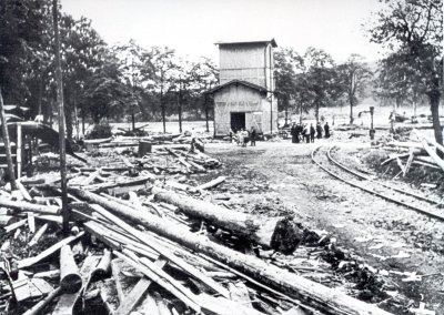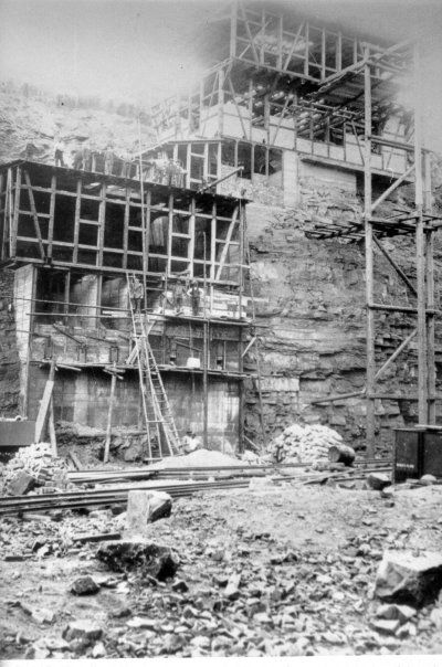 Das Foto zeigt den Bau der Verladeanlage im Steinbruch Müschede. Der Steinbruch diente u.a. während des Errichtung und Wiederaufbaus der Möhnetalsperre als Materialquelle. Ausserdem stammte der Gleisschotter der RLK von hier. Nach Aufgabe des Steinbruchs 1968 wurde das Gelände bis 1995 als Mülldeponie genutzt.