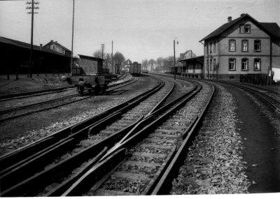 Neheim-Hüsten Hauptbahnhof zur Länderbahnzeit. Im Vordergrund, die Kleinbahnschienen
